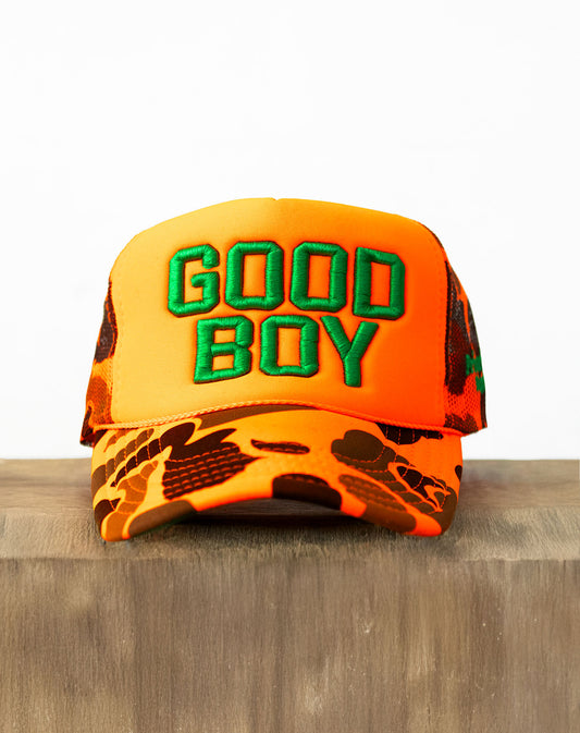 Good Boy Orange Camo Trucker Hat