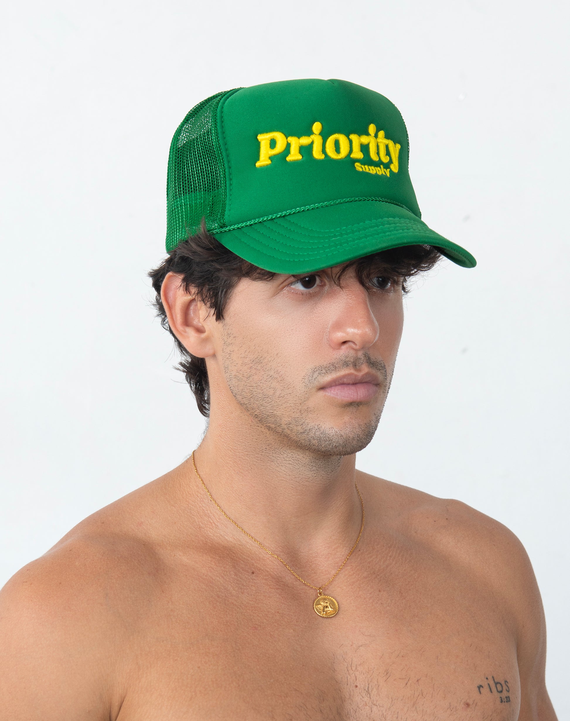 Foam Trucker Hat is constructed with rear mesh panels and a foam front. It features an integrated cotton sweatband, a pre-curved bill, adjustable plastic snap closure, and puff embroidered logo.